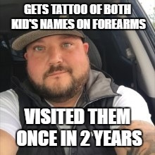 He’s only a LITTLE behind, so maybe they’ll cut him some slack. He only owes $34,140 after all. But if, by chance, a judge didn’t think it was very nice of him to dodge paying for Little Man and Baby Girl’s food and rent while ensuring that his new family was fed and housed, he’s lucky that he’s already got the perfect tattoo for his new job making license plates in county.